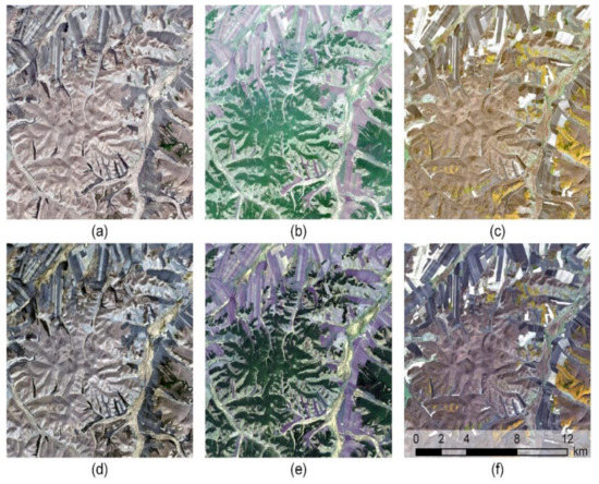 In this study, we used the 10 m resolution Sentinel 2 and 30 m resolution Landsat 8 data. As shown in Figure 3, three sets of cloud-free Sentinel 2 and Landsat 8 images (L1 products) covering the study area were obtained from the Copernicus Open Access Hub (https://scihub.copernicus.eu/) and the United States Geological Survey (USGS) websites (https://earthexplorer.usgs.gov/), respectively. Sentinel 2 images have four 10 m bands (band 2, 3, 4, 8), which were treated as the fine bands to fuse with the corresponding Landsat 8 bands (band 2, 3, 4, 5). Specifically, we employed the cloud-free Sentinel 2 image on 25 April 2018 (Figure 3a) and Landsat 8 images on 24 April 2018 and 26 May 2018 (Figure 3d,e) to predict a Sentinel-like imagery on 26 May 2018 using original and improved STARFM, ESTARFM and FSDAF (Table 1). These images were collected over a one-month timespan in the early growing season of the study site, during which we can clearly observe the vegetation phenological changes (Figure 3). Since the ESTARFM algorithm requires more than one input fine image, we further collected the Sentinel 2 imagery on 2 October 2018 (Figure 3c) and a Landsat 8 imagery on 1 October 2018 (Figure 3f). In October, the study site is at the end of the growing season, and most vegetation has experienced dramatic phenological changes compared with the beginning of the growing season in April.