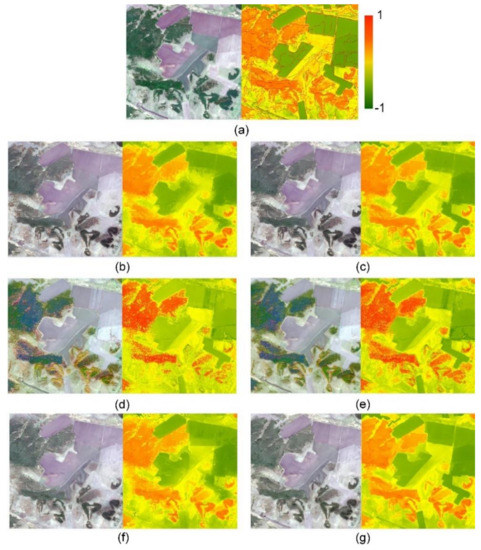 Comparisons of the Sentinel-2-Landsat 8 fused results within the red box area (3 km×3 km) of Figure 5. (a) The red-green-blue composite (left) and NDVI (right) maps of the reference Sentinel-2 image; (b–g) the red-green-blue composite (left) and NDVI (right) maps resulting from the STARFM, OSTARFM, ESTARFM, OESTARFM, FSDAF and OFSDAF, respectively.
