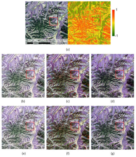 Comparisons of the Sentinel 2-MODIS fused results in the red box area (3 km×3 km) of Figure 9. (a) The red-green-blue composite (left) and NDVI (right) maps of the reference Sentinel 2 image; (b–g) the red-green-blue composite (left) and NDVI (right) maps resulting from the STARFM, OSTARFM, ESTARFM, OESTARFM, FSDAF and OFSDAF, respectively.