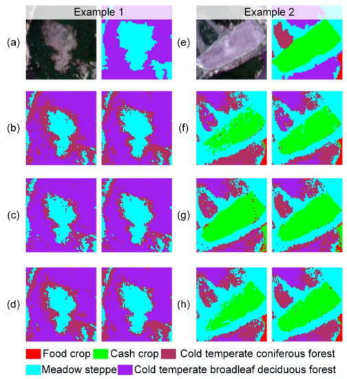 Examples (a–d: example 1; e–h: example 2) of the vegetation mapping results using different image inputs. Subfigures (a) and (e) are the reference Sentinel 2 images (left) and the corresponding ground truth vegetation maps (right); subfigures (b) and (f) are the vegetation mapping results using the fused Sentinel 2 images from the STARFM (left) and OSTARFM (right); subfigures (c) and (g) are the vegetation mapping results using the fused Sentinel 2 images from the ESTARFM (left) and OESTARFM (right); subfigures (d) and (h) are the vegetation mapping results using the fused Sentinel 2 images from the FSDAF (left) and OFSDAF (right).