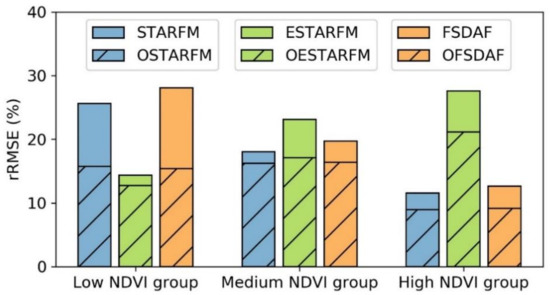 The Sentinel 2-Landsat 8 data-fusion accuracy denoted by rRMSE in low NDVI (<0.3), medium NDVI (0.3–0.7) and high NDVI areas (>0.7).