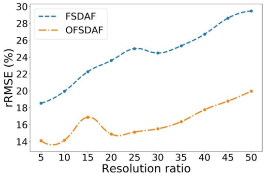 Changes of rRMSE in NDVI fusion results with different spatial resolution combinations using the FSDAF and OFSDAF methods. The resolution ratio is calculated as the ratio between the coarse image and the fine image. Sentinel 2 is used as the fine image here, and the coarse image with different spatial resolutions are simulated from Landsat 8 using a similar interpolating method as generating MODIS images.