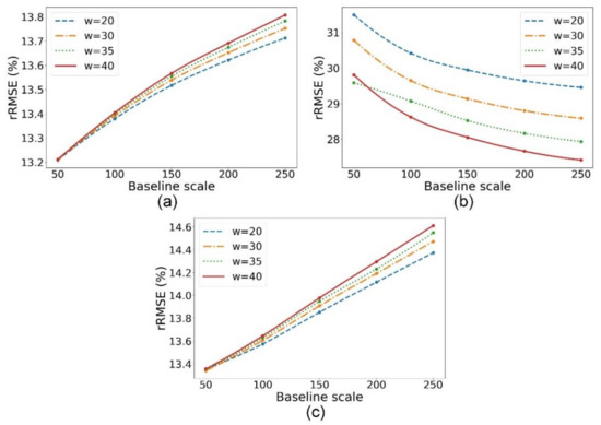The changes of rRMSE of the derived NDVI from (a) OSTARFM, (b) OESTARFM and (c) OFSDAF fused results with the baseline scale (Level 1) and search window size (noted as w in the figure) in the fusion of Sentinel 2 and Landsat 8 images.