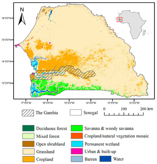 - Tappan, G.G.; Sall, M.; Wood, E.C.; Cushing, M. Ecoregions and land cover trends in Senegal. J. Arid Environ. 2004, 59, 427–462. [Google Scholar] [CrossRef]