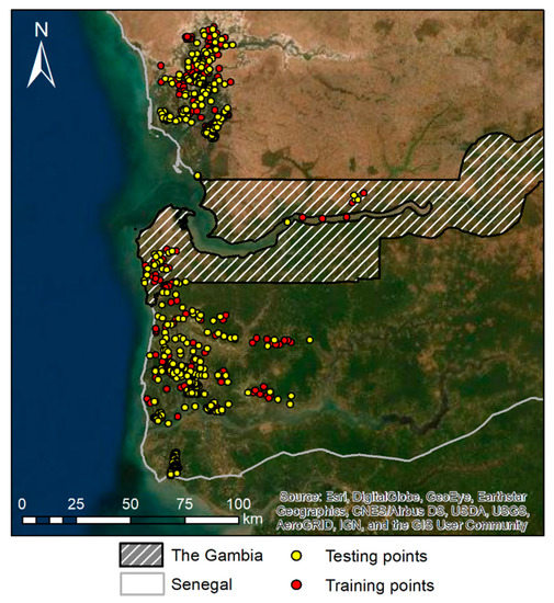 We collected a total of 800 reference points for the four land cover classes (mangrove, water, other vegetation, and sand/soil) for the Senegal–Gambia landscape (Figure 2). We used both high-resolution images available on GEE and the greenest-pixel composite to facilitate reference data collection. We considered homogeneous patches of a specific land cover (i.e., same land cover for at least 9 Sentinel-2 pixels) for collecting reference points. We avoided fragmented landscape to minimize mixed pixel issues, and/or to avoid collecting reference points from the edge of a particular land cover. For this reason, we have fewer points in The Gambia. However, the landscape was classified as a whole, and not for each country separately. Hence, fewer training points in The Gambia should not severely affect the outputs, as long as land covers have similar spectral signatures in both countries. We used a stratified random sampling approach based on a visual assessment of the relative proportion of different land covers in the coastal zone of the study area, and collected 500 points for the mangrove class, and 100 points for each of the other three land covers. We used half of the 800 points collected for training the classifiers (i.e., ‘train’ points on GEE), and the other half for accuracy assessment (i.e., ‘test’ points on GEE). We reported producer’s/user’s/overall accuracy as well as kappa (κ) coefficient [85]. Producer’s accuracy measures the error of omission, i.e., the proportion of pixels in a certain class that is being evaluated that were incorrectly classified in another category and were omitted from the ‘truth’ class as identified by the test points. User’s accuracy measures the error of commission, i.e., the proportion of pixels that were incorrectly included in a class that is being evaluated.