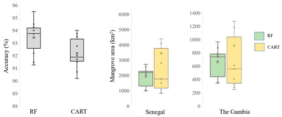 Left panel shows range (n = 10 for each classifier) of overall accuracies for the classified maps generated by the random forest (RF) and the classification and regression trees (CART). Right panel shows range of mangrove estimates generated by RF and CART classifiers for Senegal and The Gambia in 2017.