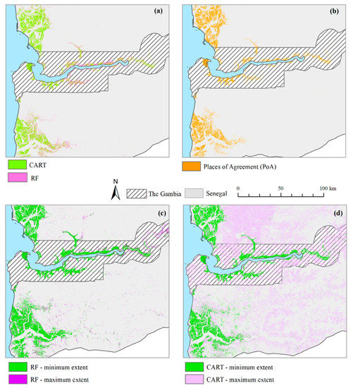 Spatial distribution of mangrove forests in Senegal and The Gambia as classified by different iterations of the two classifiers: (a) mangrove extent identified by all iterations in Random Forest (RF) and Classification and Regression Trees (CART) showing places of disagreement; (b) Places of Agreement (PoA) between the two classifiers from a total of 20 iterations; (c) spatial distribution of mangroves from the RF iterations with maximum and minimum extent; (d) spatial distribution of mangroves from the CART iterations with maximum and minimum extent.