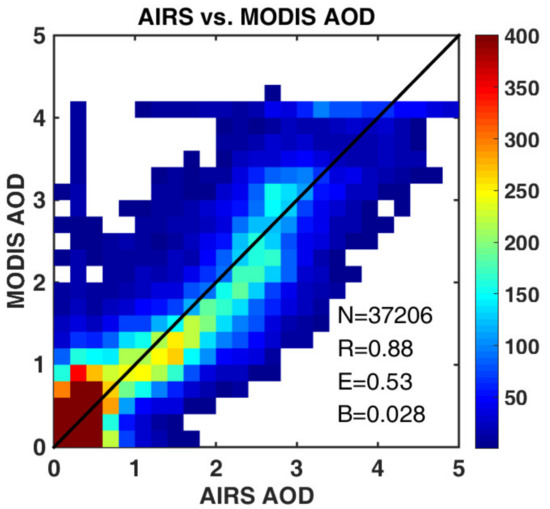 A relationship between the AIRS BTs and MODIS AODs is established. Figure 1 shows the comparison between the dust AOD extracted from AIRS and MODIS using 37,206 independent validation samples. The AIRS dust AOD is well correlated with MODIS, with a linear correlation coefficient (R) approaching 0.88, a root mean square deviation (E) of 0.53 and a deviation (B) of 0.028, which demonstrated a good agreement between the AIRS dust AOD and MODIS AOD.