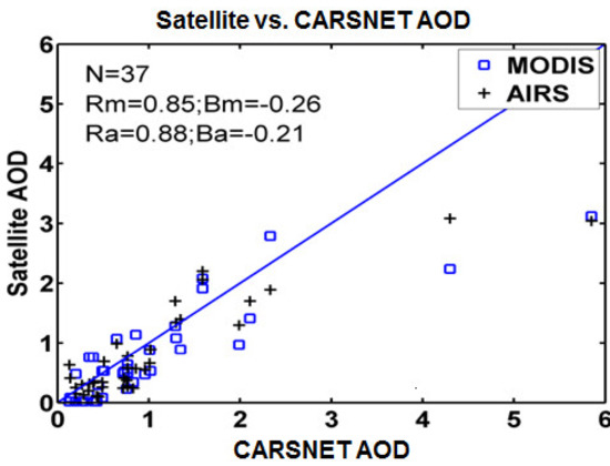 In order to further test the performance of AIRS for dust AOD retrieval, matched CARSNET AOD measurements from the Tazhong site from 2004 to 2009 were used to compare and validate AIRS dust AOD. Figure 2 shows the comparison between AIRS dust AOD, MODIS AOD, and CARSNET AOD with 37 samples. The correlation coefficient (Ra) between AIRS dust AODs and CARSNET AODs is 0.88 with a deviation (Ba) of -0.21; while the correlation coefficient (Rm) between MODIS AODs and CARSNET AODs is 0.85 with a deviation (Bm) of -0.26. The results suggest that AIRS and MODIS have similar abilities in retrieving dust aerosol optical depth. Generally, when the AOD is less than 1, the satellite-derived AOD tends to be underestimated. However, the above results demonstrate that AIRS is applicable for extracting dust AOD over land.