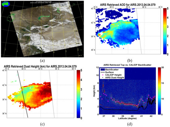 Comparison of AIRS retrievals and CALIOP observations (April 4, 2013). (a) Visible image acquired by MODIS at 15:55 on April 4, 2013 (local time), (b) dust AOD extracted from AIRS observations, (c) dust height in unit of km derived from AIRS and CALIOP track indicated by black line, (d) comparison of AIRS dust height and CALIOP observation. The backscatter in unit of km−1sr−1 is multiplied by 1000, the surface height in unit of km by black line, the CALIOP dust height in pink circle, the AIRS DTHs in black crosses.