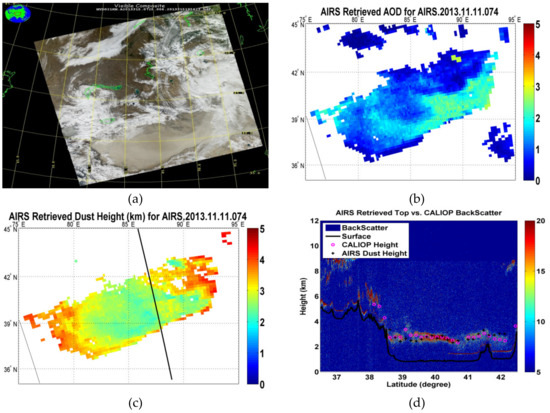 Comparison of AIRS retrievals and CALIOP observations (November 11, 2013). (a) Visible image acquired by MODIS at 15:25 on November 11, 2013 (local time), (b) Dust AOD extracted from AIRS observations, (c) Dust height derived from AIRS and CALIOP track indicated by black line, (d) Comparison of AIRS dust height and CALIOP observation, same as Figure 4.