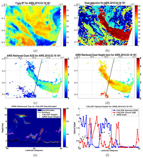 Comparison of AIRS-derived dust parameters and CALIOP observations products (March 19, 2010). (a) Infrared brightness temperature observed by AIRS, (b) Dust score derived from AIRS and CALIOP track indicated by black line, (c) Dust AOD derived from AIRS, (d) Dust height in unit of km derived from AIRS, (e) Comparison of AIRS dust height and CALIOP observations, same as Figure 4d (f) Comparison of AIRS dust AOD (black cross), CALIOP AOD, and cloud optical depth (blue and red circle line, respectively).