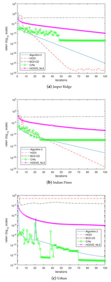 where represents the signal-to-noise ratio, and is the randomly generated tensor. We set = +60 dB, +30 dB, and +20 dB, respectively. Table 8 summarizes the outputs of the experiment, and similar to the first experiment, it shows that the most accurate algorithm in many cases is HOOI. However, the proposed algorithm produces outputs with relative errors very similar to those of HOOI, while maintaining robust convergence to the solutions. In some cases, when using Indian Pines and Urban as the input data, the proposed algorithm produces even smaller relative errors than HOOI. Note that the numbers in the parenthesis represent the average iteration numbers required for convergence under noisy conditions. Additionally, Figure 4 shows the first channel to be compressed when Jasper Ridge dataset is used. There are no significant differences except the case of BCD-CD.