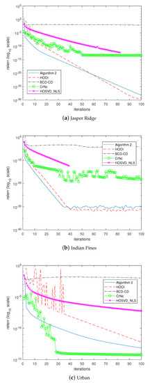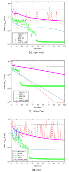 The last experiment examined how the algorithms would converge to the solutions. In the experiment, the algorithms were forced to continue until 100 iterations without considering the stopping criterion. Figure 5, Figure 6, Figure 7 and Figure 8 depict the histories of convergences when , , , , respectively. Additionally, Table 9 shows the relative errors of outputs after the iterations reached 100 steps. In this experiment, even though the overall shapes of convergence histories from CrNc appear better than the others, the outputs of CrNc seem to converge to the relatively inaccurate local minimum, as shown in Table 9. The convergence speed of HOSVD_NLS is very slow according to this experiment, but no-meaningful differences with HOOI in terms accuracy were generated. Furthermore, HOOI produces unstable convergence history occasionally. In any case, Algorithm 2 produces robust outputs with stable convergence histories and with the accuracy close to that of HOOI.