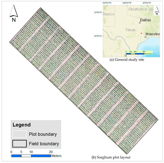 Study site: (a) Map inset showing general location of study site (red dot) within Texas. Base map courtesy of ESRI ArcGIS®; (b) Sorghum plot layout–plot boundaries displayed in white over a field orthomosaic background. Each plot measured 0.75 m by 6.0 m.