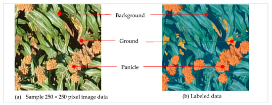 Labeled panicle data for deep learning based semantic segmentation were developed from 250 × 250 pixels sample images cut out from full UAS scenes. Three semantic classes were defined as follows: Panicle, for all panicle instances in an image; Ground, for exposed ground surfaces in the image and; Background, for green foliage and any shadowed regions in the image as illustrated in Figure 2. The manner in which the semantic classes are modeled depends on the goal of the application. While two semantic classes (panicle and background) would have sufficed, we modeled ground as a separate class to provide a better scene characterization. In addition, ground and panicles may look similar, so modeling them separately enable a trained model to be more robust to these similarities. In selecting sample images, we tried to make the sample set as representative as possible by including various scenarios. We selected samples with panicles of different colors, samples without panicles, samples with pure classes (e.g., ground only) and samples from images captured at different angles. Labeling for semantic segmentation requires that all pixels in each sample images are labeled. Thus, we digitized all pixels in each sample into predefined semantic classes using the Image Labeler tool in the MATLAB® software (www.mathworks.com). The Image Labeler provides an easy interface to mark a variety of regions of interest (rectangular, pixel, polygon) in sample images to define targeted ground truth for semantic segmentation and object detection. We labeled 462 samples.