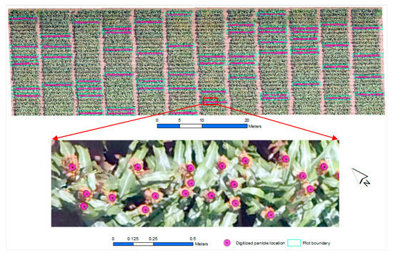 We evaluated the performance of our panicle counting method both in terms of individual panicle detection and in terms of overall plot-level correlation by comparing estimated panicle counts with manually digitized panicle data. We randomly selected 60 plots and manually digitized panicle locations from the orthomosaic (Figure 4). In cases where multiple panicles touched, we digitized them as separate entities to test how effective the developed procedure would perform at separating them.