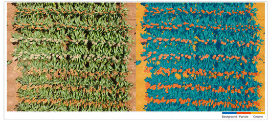 While we strove to digitize each semantic class as closely as possible, we sometimes missed or sub-optimally digitized subtle objects. Small objects presented the most challenge in the labeling processes due to the difficulty in digitizing them and the image resolution limitation. However, the model was generally robust to such omissions and generated the expected output as illustrated in Figure 6c. However, such missed objects, while correctly segmented, still contributed to lowering the IoU scores because the ground truth was considered perfect. Lastly, artifacts in the orthomosaic also contributed to wrong segmentations at the field level. Errors in 3D reconstructions and orthomosaic generation are well known in UAS image processing [54,55]. Estimation based on individual images could alleviate this limitation, as was demonstrated in [56] for estimating crop cover percent.