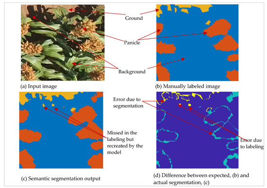 Errors of commission among the three classes contributed to loss of performance of the semantic segmentation model. The model misclassified some dry foliage and textured ground surfaces as panicles. The segmentation was also poor around object edges as illustrated in Figure 6b. The lack of crisp edges in semantic segmentation is a well-known problem in SegNet architectures due to the down-sampling involved in the encoder part of the network [23]. Errors in segmenting panicle objects could also be attributable to the dominance of other features in scenes [53], which made it difficult for the model to segment relatively smaller panicle objects. This, together with edge errors, contributed to lowering the IoU metrics especially for panicle class (80%). Nevertheless, an IoU score of 80% was high enough to overlap all panicle instances which contributed to lower omissions of panicle objects.