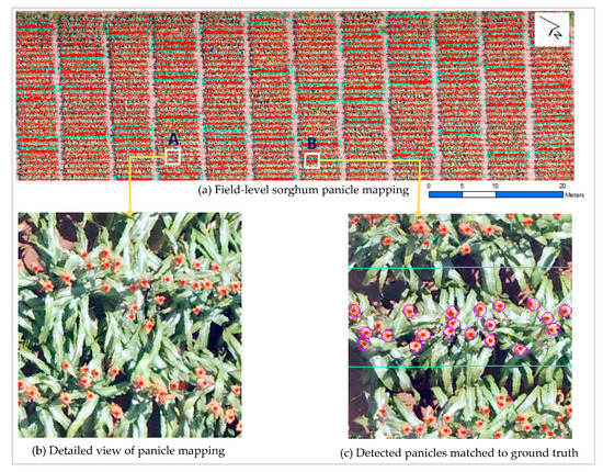 Sorghum panicle mapping: (a) Field-level sorghum mapping, mapped panicles shown in red, cyan outlines present the validation sample plots; (b) Detailed view from A in (a) showing detected sorghum panicles (red) over a background orthomosaic; (c) Detailed view from B in (a) showing detected panicles (red) matched to manually digitized panicle locations (purple circles).