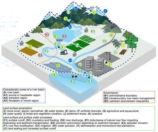 Schematic overview of a river basin showing selected land surface parameters and related processes (several symbols used are adopted or modified according to courtesy of the Integration and Application Network, University of Maryland Center for Environmental Science).