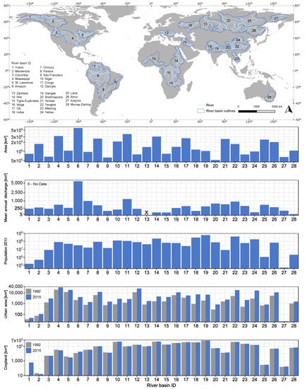 Characteristics of selected major river basins (selection procedure is described in Section 2). River basin outlines and data on river basin area and discharge are obtained from the Global Runoff Data Centre (GRDC) [17]. Population data is extracted from CIESIN population dataset [18] and spatial information on urban areas as well as rainfed and irrigated croplands from European Space Agency’s (ESA) Climate Change Initiative (CCI) Land Cover [19].