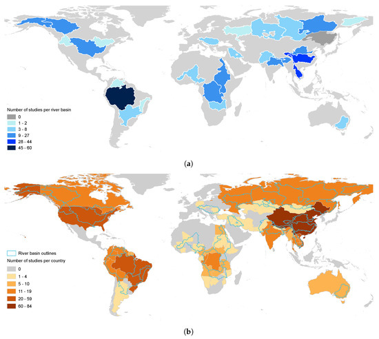 In Figure 3b, the number of reviewed research articles per investigated country is illustrated. Considering the riparian countries of the Amazon river basin, we found that the number of studies is highest for Brazil (e.g., [34,35,36,37]). Although river basins are a functional unit regardless of national boundaries, Figure 3b clearly indicates areas of special interest. With more detail, these include China, Brazil, Vietnam, and the United States of America, where the percentage of studies amounts to ∼29%, ∼21%, ∼11%, ∼8%, respectively. For several major river basins, such as the Niger, Nile, Zambezi, and Danube, it becomes apparent that the territory of some countries included in the functional unit of the river basin remained entirely unstudied.
