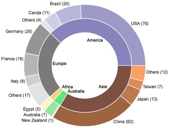 Institutional affiliation of first authors by continent and nation. The number of reviewed studies is provided in brackets.