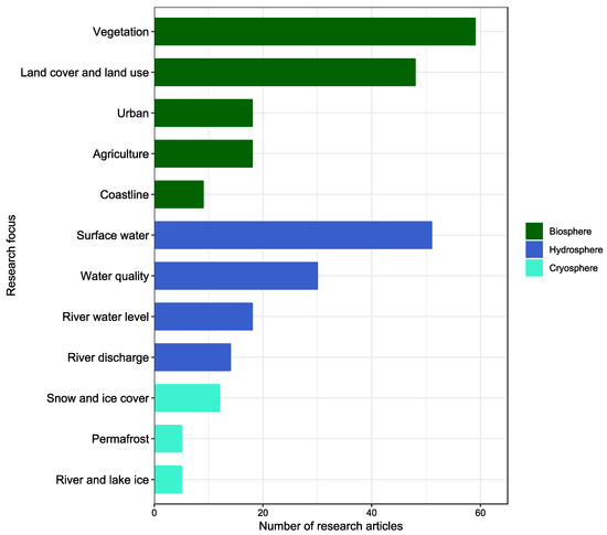 The remaining 287 studies were analyzed to extract relevant information for this review, such as the parameters research focus, employed remote sensing sensor, spatial scale of the study area, and temporal resolution of the study (see Supplement Table S1). Regarding the thematic focus of this review, the research articles were categorized into “biosphere”, “hydrosphere”, and “cryosphere”. Studies analyzing urban areas were assigned to the category “biosphere”. Throughout the literature review, research foci were identified and associated with one of the defined spheres. Corresponding research foci are listed in Table 2.