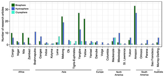 Figure 6 presents the number of reviewed research articles with respect to one of the defined research categories per investigated major river basin. This figure indicates that Arctic river basins as well as several river basins with highly mountainous source regions, such as the Indus and Tigris–Euphrates, have a comparably higher share of studies associated with the category cryosphere. In the case of the Brahmaputra, Columbia, Orinoco, Sao Francisco, St. Lawrence, and Volga river basins, all reviewed articles investigated research foci related to the hydrosphere. Yet, the total number of reviewed articles is comparably low for these river basins. Furthermore, for the Amazon, Congo, Mekong, Yangtze, and Yellow river basins, the category biosphere accounted for more than half of all studies in each individual river basin.