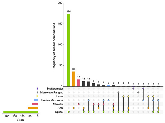 In terms of used sensor types within the studies, we found that imagery recorded by optical sensors were most frequently used (see Figure 7). Specifically, ∼61% of all studies rely solely on optical remote sensing data. Furthermore, ∼13% of all studies only used SAR and ∼6% altimetry data. Optical and SAR data are most frequently combined (∼5%), while synergistic use of optical and passive microwave data accounted for ∼4% of all investigations. Further sensor combinations are visualized in Figure 7 and amount together to ∼11%.