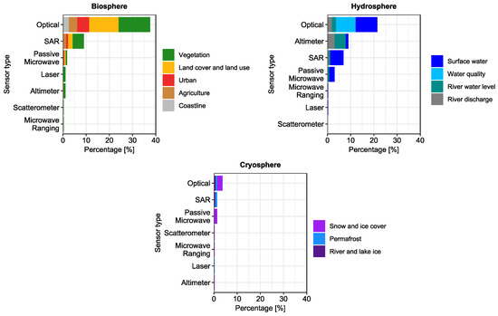 Regarding the research category cryosphere, optical imagery was most often used (∼13%) for snow and ice (∼2%) as well as river and lake ice monitoring (∼1%). Studies focusing on permafrost employed SAR data in most cases (∼1%).
