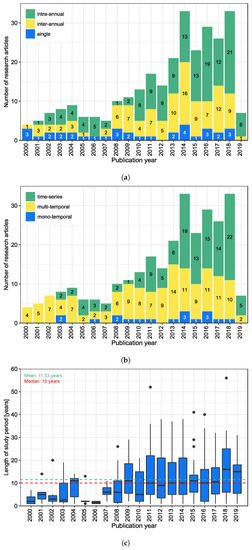 Number of published studies per year and their temporal resolution with respect to (a) change detection analyses and (b) employed satellite imagery. The boxplots demonstrate the (c) length of the study periods of all reviewed articles per publication year.