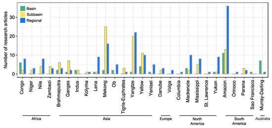 Number of reviewed research articles categorized by major river basin and their investigated spatial scale.