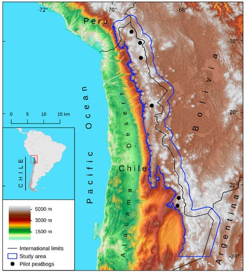 The Altiplano plateau extends over 1000 km latitudinally (15°S–23°S) and is situated in the Central Andes between the Atacama Desert to the west and the tropical humid lowlands to the east. In this semiarid bioregion, annual precipitation decreases from around 450 millimeters (mm) in the northeast region bordering the Amazon basin to less than 150 mm in the southwest sector adjacent to the Atacama Desert. More than 80% of the total annual precipitation falls during summer as part of the South American monsoon [29], which is partially modulated by the El Niño–Southern Oscillation phenomenon [30]. Our study region encompassed the entire Chilean Altiplano, representing the driest sector of the plateau, and a 30 km buffer beyond the country border to prevent the arbitrary division of peatlands that cross administrative country boundaries (Figure 1). In total, our study covered an area of 63,705 km2, above 3700 m.a.s.l., and between 17.3°S and 24.0°S and 70.0°W and 66.8°W. Floristically, the high Andean peatlands are primarily composed of cushion-forming species from the Juncaceae family such as Distichia muscoides, Oxychloe andina, and Patosia clandestine [31]. Measurements within our study area made by Cooper et al. [10] found that peatland height increases from 0.96 to 5.37 cm/yr, has a mean bulk density of 0.081 g/cm3, and mean organic carbon production rates ranging from 1.5 to 4.0 kg/m2/yr.