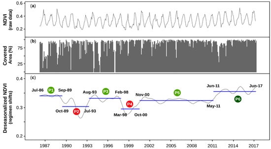 Regime changes detected for the regional mean NDVI time series. (a) mean monthly NDVI time series, (b) percentage of monthly non-missing peatland data for the study area, and (c) regime shifts in the mean NDVI signal, showing two partial drops in 1989–1993 and 1998–2000 and one final increase (greening) between 2011 and 2017.