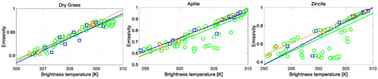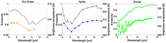 The purpose of this section is to explore the real correlation between brightness temperature and emissivity. Brightness temperature is obtained from land-leaving radiance under the assumption of emissivity ε = 1 for every band. As is shown in Equation (2), land-leaving radiance R B O A λ is a function not only of the temperature and the optical and geometrical properties of the ground materials, but also of some portion of reflected downwelling radiance.