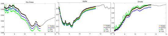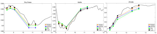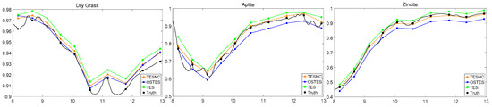 It is shown that, compared with OSTES and TES, the method proposed in this paper performs better in emissivity retrieval accuracy. In all cases, the TESNC emissivity spectra appear to be closer to the true emissivity spectra taken from ASTER spectral library [27]. For different materials, the improvement becomes more and more obvious with the emissivity decrease. There is a little improvement for high emissivity material, while more improvement for middle and low emissivity materials. For different sensors, more bands can be more conducive to prove the effectiveness of the algorithm proposed in this paper and the reason has been explained in Section 3.