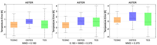 Figure 7. The temperature retrieval errors produced by different algorithms, TESNC (orange), OSTES (blue), and TES (green), are represented with the box plots. Moreover, the minimum and maximum of errors are shown with whiskers. The results are obtained by applying algorithms on ASTER synthetic data and divided into three groups according to different MMD (Maximum–Minimum emissivity Difference) levels.