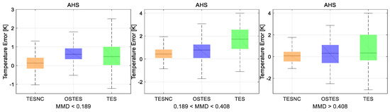 Figure 8. The temperature retrieval errors produced by different algorithms, TESNC (orange), OSTES (blue), and TES (green), are represented with the box plots. Moreover, the minimum and maximum of errors are shown with whiskers. The results are obtained by applying algorithms on AHS synthetic data and divided into three groups according to different MMD levels.