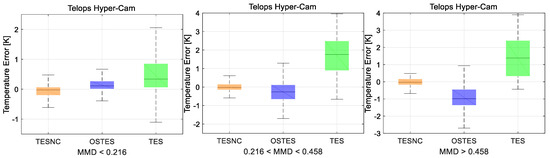 Figure 9. The temperature retrieval errors produced by different algorithms, TESNC (orange), OSTES (blue), and TES (green), are represented with the box plots. Moreover, the minimum and maximum of errors are shown with whiskers. The results are obtained by applying algorithms on Telops Hyper-Cam synthetic data and divided into three groups according to different MMD levels.