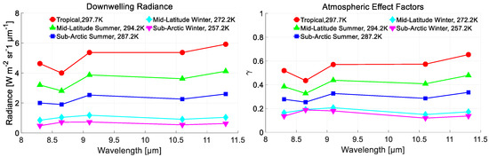 Figure 10. The downwelling radiances and atmospheric effect factors of different atmospheric conditions.