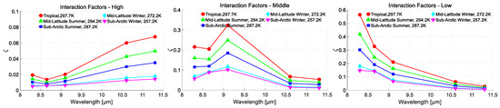 For materials with high emissivity, all the interaction factor values are less than 0.1 no matter what kind of atmospheric condition, which means a less noticeable atmospheric effect on this surface type. For materials with middle emissivity, most of the interaction factor values are more than 0.1, which means the atmospheric effect cannot be neglected. However, the effect in Sub-Arctic Winter conditions is still not severe, because its downwelling radiance and atmospheric effect factors are small in this atmospheric condition. For materials with low emissivity, all the interaction factor values are more than 0.1. Thus, the atmospheric effect must be taken into account for low emissivity materials.
