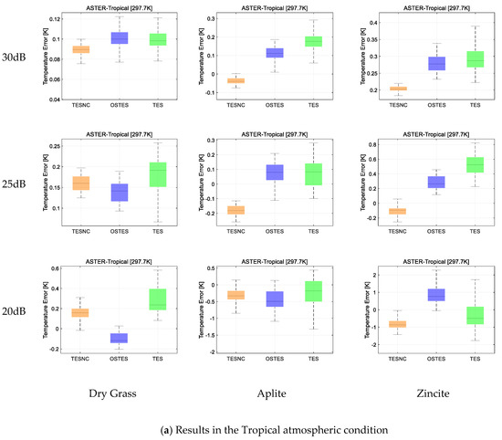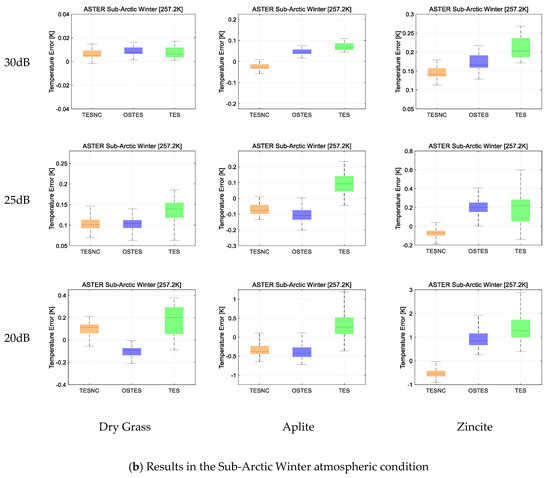 As for different atmospheric conditions, the improvement of TESNC is more obvious in the Tropical condition, where the atmospheric effect is more severe, while the accuracy of temperature is higher in Sub-Arctic Winter. It is noted that, compared with OSTES, there is little improvement in TESNC for middle MMD material. The reason for this has been explained in Figure 11. The interaction factors are still small because of the low downwelling radiance and atmospheric effect factors. Thus, the atmospheric effect is not severe for obvious improvement of TESNC.