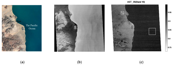 Figure 13. The chosen area, San Felipe City (Mexico) and the Pacific Ocean, for the algorithm test in Google Maps (a), ASTER data (b), and AST_05 (c). The big white square in (c) represents the first chosen region of size 100 × 100 pixels over cloudless waterbody in the Pacific Ocean (bottom-right), whose mean emissivity approximately 0.96. The small white square represents the second chosen region of size 40 × 40 pixels (top-left), whose mean emissivity is approximately 0.75.