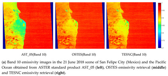 For emissivity smoothness analysis, emissivity retrieval images of AST_05, OSTES and TESNC for 21 August 2018 (band 10), along with the histograms for all scenes, are illustrated in Figure 14. Histograms statistic samples in the first region mentioned in the previous paragraph. The vertical line depicted in the histograms indicates the expected value of water emissivity retrieved from ASTER spectral library [27]. As it is shown, noise and striping are obvious in AST_05, especially in the homogeneous water area, while not in the OSTES and TESNC. The smoothing effect between these two methods is very similar. Striping is thoroughly discussed in [37,38]. Histograms also show the inhomogeneous emissivity in AST_05 and the emissivity values are clustered around two distinct values, such as 3 March 2012 (band 10–13), 21 June 2018 (band 10–13,14), 27 September 2013 (band 10–13).