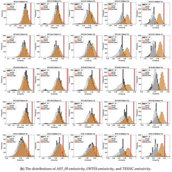 Figure 14. The band 10 emissivity images in the 21 June 2018 scene of AST_05, OSTES and TESNC are plotted in subfigure (a). In all the images, the same contrast stretching is used. Histograms in subfigure (b) show the distributions of AST_05 emissivity, OSTES emissivity, and TESNC emissivity. Vertical line depicted in histograms indicates the expected value of water emissivity retrieved from ASTER spectral library [27].