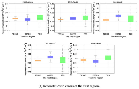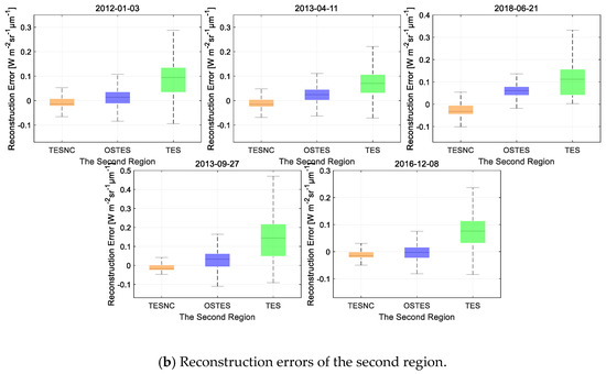 Figure 15. Box plots the reconstruction error of surface leaving radiance produced by TESNC (orange), OSTES (blue), and TES (green) algorithms for the ASTER sensor. Results are divided in two groups based on the different chosen region, the first region with a mean emissivity of approximately 0.96 (a) and the second region with a mean emissivity of approximately 0.75 (b). Whiskers represent the minimum and maximum of the reconstruction error.