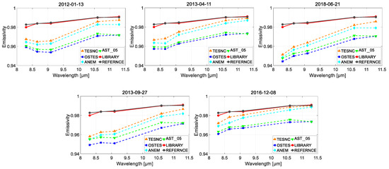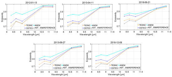 The results in Figure 17 show a better agreement of TESNC, with differences below 0.01 in some cases with respect to reference AST_05. All method good results in the last two channels with high emissivity, but there are significant overestimating in the first three channels with lower emissivity, especially for the ANEM and OSTES method. OSTES performs better than ANEM, but worse than TESNC. The improvement of TESNC is more obvious on 11 April 2013, 21 June 2018, and 27 September 2013, because the temperature can be higher in these months.