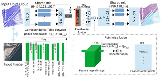 However, image features are derived from a CNN with 3 × 3 kernel and therefore, it carries neighboring pixels information in a particular pixel. Therefore, it is more meaningful to fuse point cloud features with spatially corresponding pixels (Equation (4)) unlike just global image features in GMNet. Therefore, this paper proposed PMNet, which can jointly train and fuse point-wise features of 3D point clouds and corresponding 2D image for semantic segmentation with an end-to-end manner. In order to extract corresponding pixels, we need to retain the original shape of the aerial images, hence we adopted an Encoder-Decoder network which can retain the original shape of images using deconvolution/upsampling operation as in UNet []. In order to fuse the point-wise correspondence features, we defined a correspondence table using point cloud coordinates which have provided in the feature column of the original point cloud (input) and the aerial image patch. Point cloud index () has developed using a correspondence table which used for point-wise feature fusion. Fused features further processed using two MLP layers finally a softmax cross-entropy activation function for defined number classes was carried out as shown in the architecture of PMNet (Figure 1).